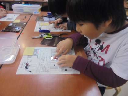ソーラーパネルやコンデンサなど,細かい部品もたくさんあったのですが,みんな集中して完成させていました。
