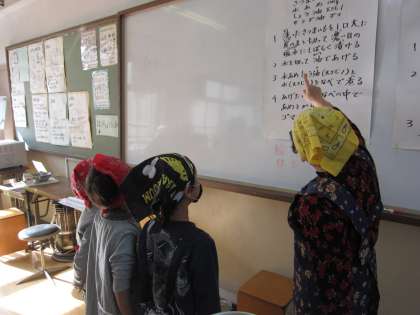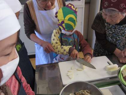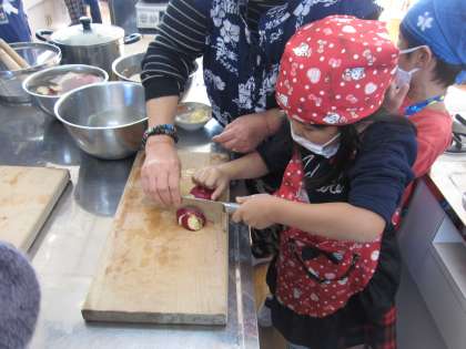 今日は子どもたちが,心待ちにしていた「おいもパーティー」の日でした。朝から,何だかそわそわ。忘れ物がないか,友だち同士で確認し合っていました。「先生,いよいよだね。」「楽しみ過ぎてドキドキしてきた。」など,話題はおいもパーティーのことでもちきりでした。地域の女性会の皆様に,優しく丁寧に,「大学いも・スイートポテト・おみそ汁」の作り方を教えていただきました。