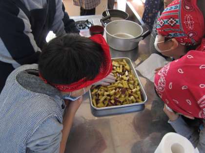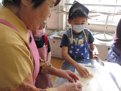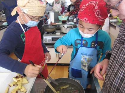 1組は,3・4時間目に,3つのグループに分かれて調理を始めました。地域の女性会の方を名人とお呼びし,いろいろなことを教えていただきました。