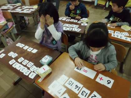 たしざんやひきざんをつくり,そのうちの1枚を裏返しにし,その数をあてるゲームをしました。