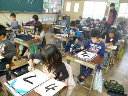 そろそろ年末。書き初めの練習の季節です。3年生は「力」を書きました。「おれ」と「はね」の筆の運びに気を付けて、みんな真剣な表情で練習していました。