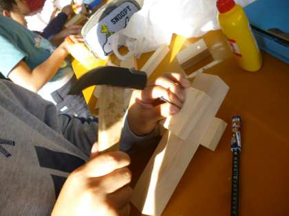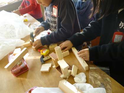 いろいろな形の木片を組み合わせて、工作を作りました。初めて、釘打ちにも挑戦しました。なかなかみんなセンスもよく、上手に打ち込んでいました。