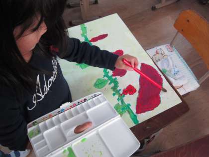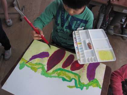 先週,おいもの絵を下書きをしました。今日は,パスで色を塗り,背景は絵の具で塗りました。