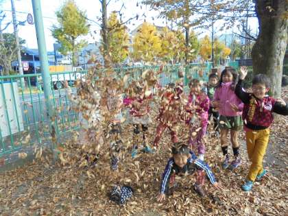 「落ち葉のおやまがお布団みたいにふかふかだったよ。」