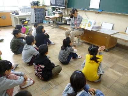 今日は図書ボランティアさんが読聞かせをしてくれました。朝から静かにお話の世界にひたっている子どもたちです。