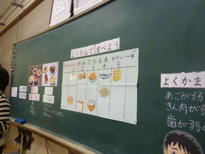 食育の授業では、しっかりかんで食べることの大切さを学びました。その後の給食では、自分たちがしっかりかんで食べているのかを振り返ることができました。