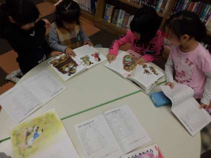 教科書を見て話していたお話がないかな…と図書室で昔話を探しに行きました。