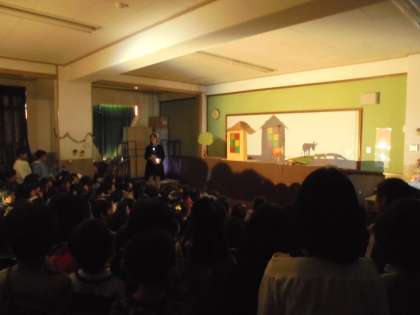 暗くなった部屋の中,ライトに照らされたペープサートを動かしながらの劇で,子どもたちはお話の世界にどっぷりと浸っている様子でした。