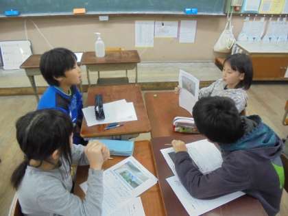 今日は鑑賞タイム。自分が考えた妖精がどこにいて,何をしているかなどのプロフィールを紹介し,感想を交流しました。