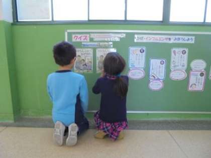 保健室前の掲示版には、これまでの「ほけんだより」で紹介した健康カルタを掲示しています。今は子どもたちから健康カルタを募集中です。感染性胃腸炎やインフルエンザが流行する季節になりました。予防の基本は手洗い・うがい。健康カルタの内容を実行して、寒い冬も元気にすごしてほしいです。