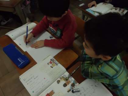 今日は,友だちに「今,一番楽しいと思うこと」をたずねて,聞いたことをノートにメモをとりました。聞いた中から大事なことを落とさずに書くことが難しいようでしたが,一生懸命取り組んでいました。