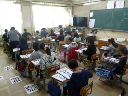 今日の書写はカタカナで「ビル」を書きました。気をつけるポイントは「曲がり」と「おれ」の筆使いです。ポイントに気をつけながら集中して取り組んでいました。