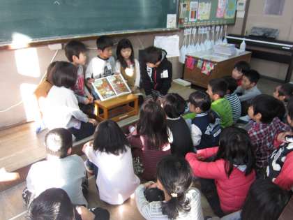 本係さんが「十二支のおせち料理」のお話の本を読み聞かせてくれました。聞き手に聞きやすいようにゆっくり読んでいました。