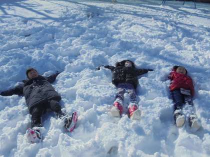 運動場では雪合戦や雪だるま作りをする子や,雪の上に寝転がり「ふかふかだー。」と嬉しそうにしている子など,それぞれが楽しみを見つけていました。
