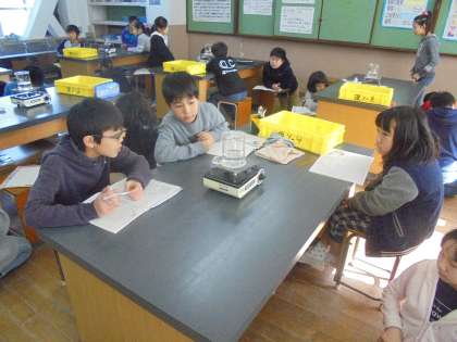 理科では「すがたをかえる水」という新しい学習に入りました。初日の今日は学習問題を考えました。「すがた」をかえた「水」といえば,「氷」「湯」などの意見が出て,なぜそのようにすがたをかえるのか。温度が関係してそうだ。という疑問や予想が出てきました。