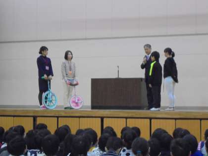 児童朝会では,まず一輪車の贈呈式を行いました。