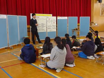 子どもたちは,重い砂袋をどうすれば小さな力で持ち上げることができるかを,グループごとに話し合い,実験で確かめました。実際に体験することで「うわ〜」「すごく重い」など,実感することができていました。