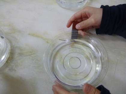 2つ目の実験では、プラスチックのカップの中に水を入れ、そこに発泡スチロールがついた鉄の棒を浮かべたものを用意しました。カップの外側から磁石を近づけ、鉄の棒を引きつけることはできるのかを確かめました。