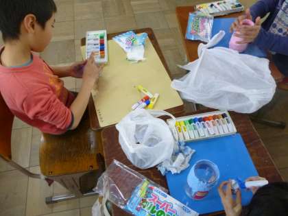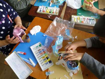 図工では、絵の具を練りこんで色付けした紙粘土をびんにつけ、デザインしたハッピー小物入れを作っています。それぞれに工夫して素敵な小物入れが出来上がっていきました。