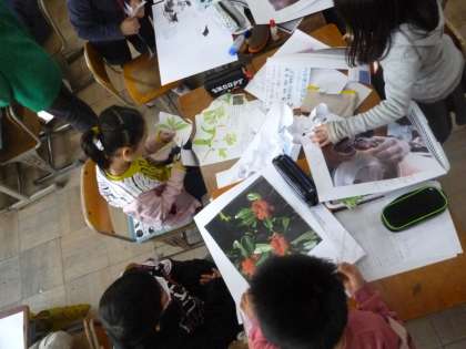 総合では、一年間の総合の学習を振り返って、グループに分かれて調べ学習をしました。梅やヤマモモ、大根などこれまでの学習で味わったものを図書室の本などを活用して調べ、グループごとにまとめています。