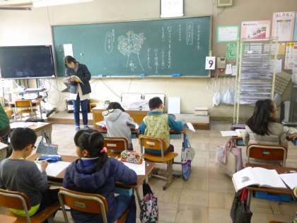 今日はモチモチの木の学習で、「灯がついたモチモチの木」を見た豆太の気持ちを考えてその様子を簡単な絵に表しました。勇気のある子どもは見ることができるモチモチの木のきれいな姿を想像して描いていました。