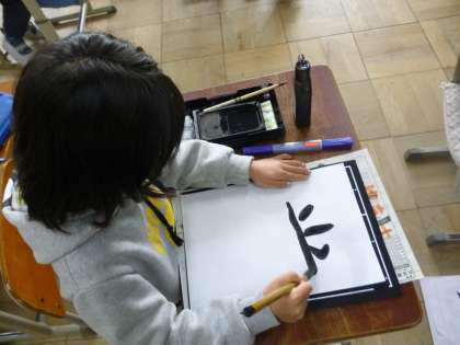 書写では「光」という字を書きました。お手本のプリントをなぞったり、はらいやはねなどの部分練習をしたりしました。しっかり練習した後は、いよいよ半紙に清書です。半紙に書いたものの中から一番きれいに書けたものに名前を書きました。3年生最後の書写になりました。4年生になっても3年生で学習したことを忘れずに頑張っていってもらいたいと思います。