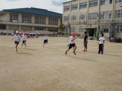 50m走のタイムを測りました。子どもたちは,「さすが6年生。」と思わせるぐらい力強い走りでした。走り終わった後の子どもたちは,「去年より速くなった。」「○秒台になった。」「もっと速くなりたい。」とうれしい言葉が溢れていました。