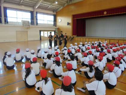 今日の体育は3クラス合同の学年体育をしました。運動会に向けて、大学生のお兄さん、お姉さんに踊りを教えていただきました。かっこいい踊りに子どもたちは目を輝かせていました。