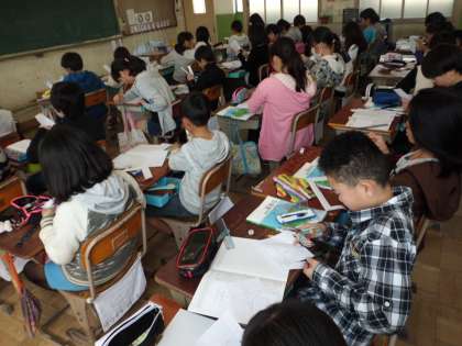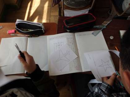 「線対称の図形をかこう。」というめあてで,「星」と「飛行機」をかきました。対称の軸を意識してしっかりかけました。