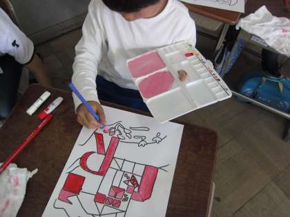 二色の絵の具を使って,色の濃さを変えながら塗り絵をしました。子どもたちは,色の変化を楽しんでいました。