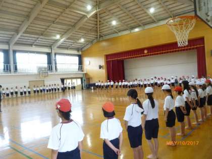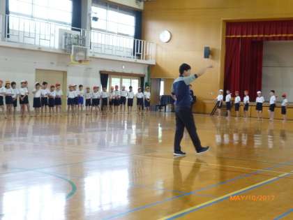 今日は初めて学年全体で騎馬戦の練習をしました。クラス毎に一列に並び、騎馬の組み方を教えてもらいました。上の乗る人、下で支える人、互いの気持ちを1つにして、良いチームワークで、どの騎馬も活躍できるように頑張りたいです。