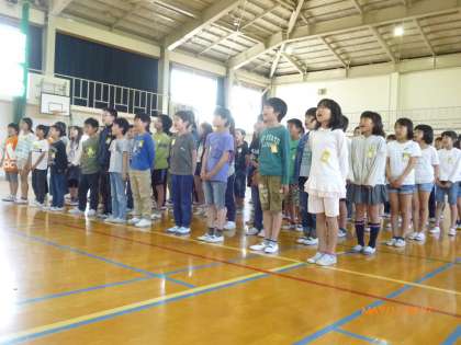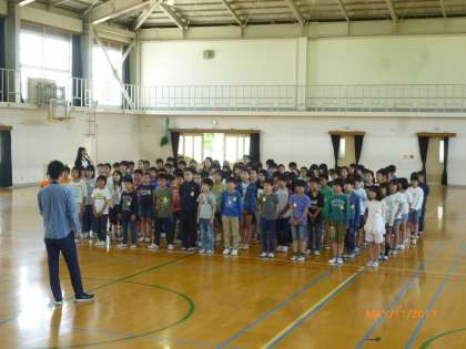 来週の火曜日に「1年生を迎える会」があります。5年生は1年生の入学のお祝いにソーラン節を披露します。、まず、みんなでお祝いの言葉の練習をしました。大きな声で心をひとつにして発表しました。