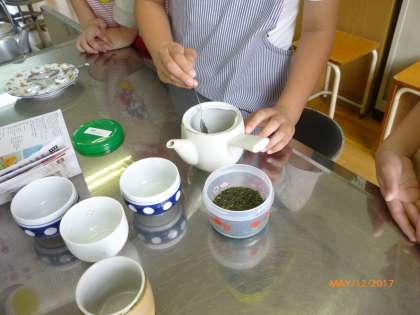 今日は緑茶を入れます。お湯を沸かして、急須に茶葉を入れて人数分につぎ分けます。