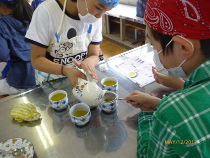お湯が沸きました。やけどをしないよう気を付けながら、急須に注ぎます。みんな真剣なまなざしですね。