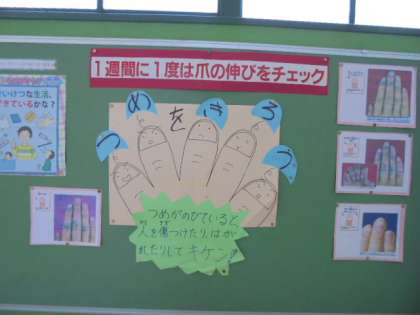 今回は、特に爪に注目です。運動会の練習もはじまりました。爪が伸びていると、自分がけがをするだけでなく、ほかの人に爪が当たってけがをさせてしまうこともあります。
