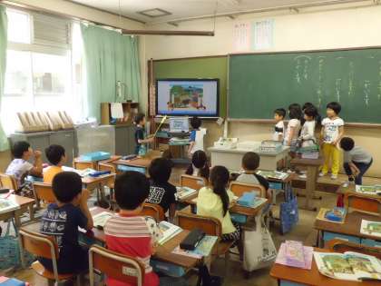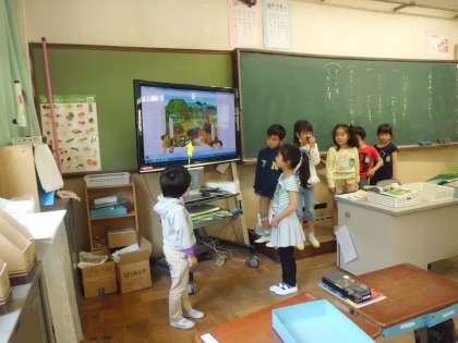 今日はテレビに拡大して映した絵を見ながら,みんなの前で発表しました。