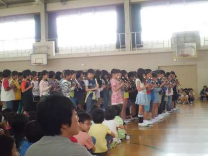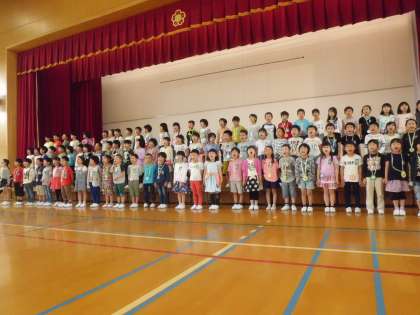 1年生からも,ことばと歌でお返しをしました。ことばの中には,1年生が見つけた,常磐野小学校のいいところを入れました。元気よく校歌も歌い,楽しい会となりました。その後,また6年生に手をつないでもらい,退場しました。