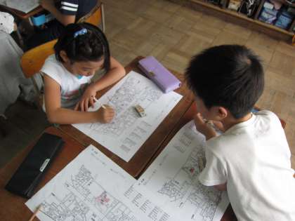 昨日,町探検に行き,丸太町通りを中心に調べていきました。探検に行って分かったことを,地図やノートにまとめました。自分でまとめた後,グループで話し合いを進めていきました。丸太町通の特徴について気付くことができました。