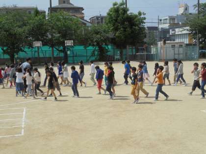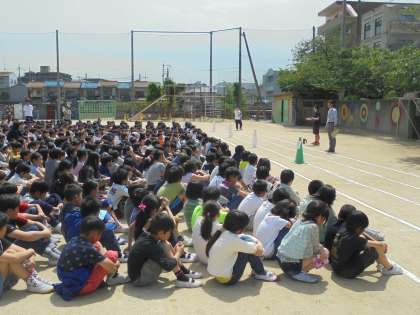 今回の避難訓練では,理科室で火災が発生し,燃え広がる恐れがあるという想定で運動場に避難しました。