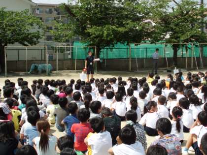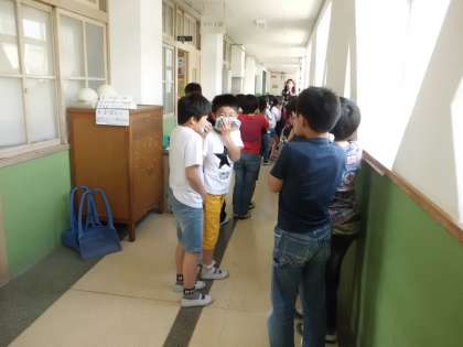 今日は火事のときの避難について訓練しました。ハンカチで鼻や口をおさえ,姿勢を低くくして避難することや,「おはしもて」に気をつけることなどを確認し,避難しました。