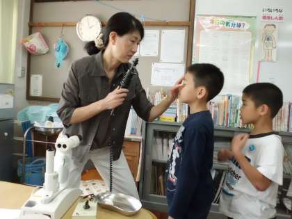 校医の西田先生に来ていただき,目の検査をしてもらいました。耳鼻科と同じく,水泳学習が始まる前に大切な検診です。必要な人は受診をしておきましょう。