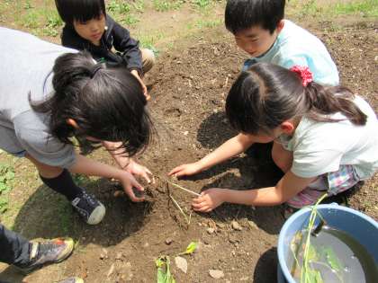 みんなは,土をお布団のようにやさしくかけて苗植えをしていきました。