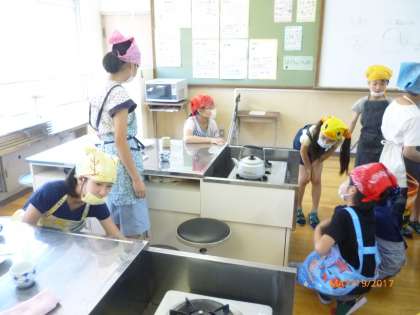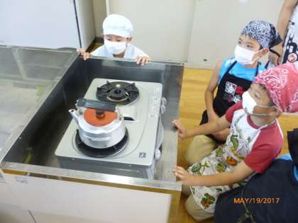 ガスコンロの使い方も慎重に!家のコンロと違うのと、火を扱うので、みんな真剣な眼差しで炎を見つめます。
