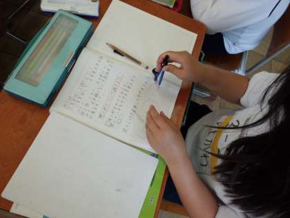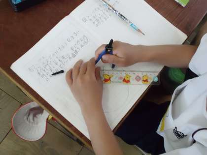 早く使いたくて仕方なかったコンパスの使い方をついに学習しました!いつもはしいている下敷きを外し,もつところに気をつけてうまく角度をつけて回します。慣れるまではスタートとゴールがうまく合わなかったり,思っている半径と違う円ができたりしてしまうかもしれませんが,たくさんかいて慣れていきましょう。