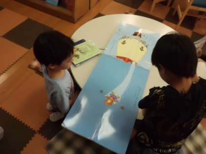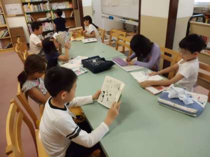 図書館に行って本を返したり借りたりしました。みんなおもいおもいに本を読んだり,読んだ本を読書ノートに書いたり,大型絵本を何人かで読んだり…。とても静かで落ち着いた時間を過ごしていました。
