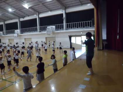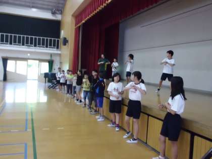 中間休みに黄組の前で準備運動のダンスをしました。上野先生のを中心に高学年の子どもたちがダンスの見本を見せました。