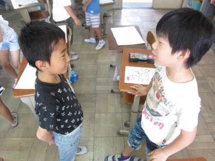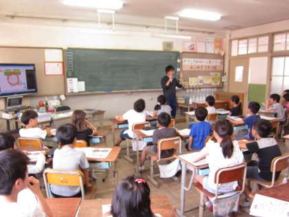 先週に引き続き,今日は1組に,蜂ヶ岡中学校で英語を教えておられる津田先生が来てくださいました。津田先生が英語で自己紹介をされても,少しずつ聞きとれる子,なんとなくお話されていることが分かってきた子が増えてきました。