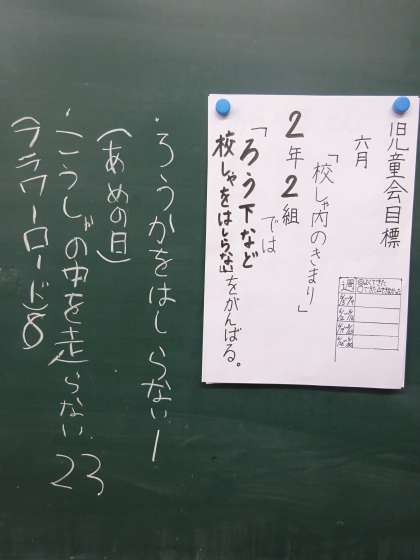 6月の児童会目標は,「校舎内のきまりを守ろう。」です。2年2組では,それをもとに,「廊下などの校舎内を走らないこと」をがんばりたいと思います。