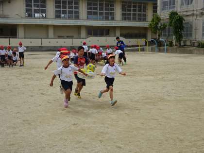 運動会では,2年生と5年生で,「おかごでわっしょい」という競技に取り組みます。2年生と5年生で4人グループを作り,かごに入ったボールを運び,走ります。これがなかなか難しく,ボールが落ちてしまうことも。速く走ること,ボールをバランスよく運ぶこと,4人で力を合わせることが大事です。2年生は,5年生のお兄さん・お姉さんに優しく教えてもらったり,一緒に練習をしたりして,とっても嬉しそうでした。これからの練習や当日が楽しみです。