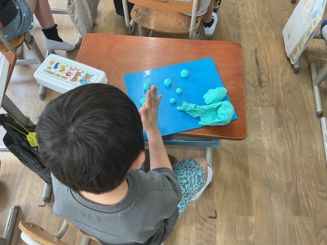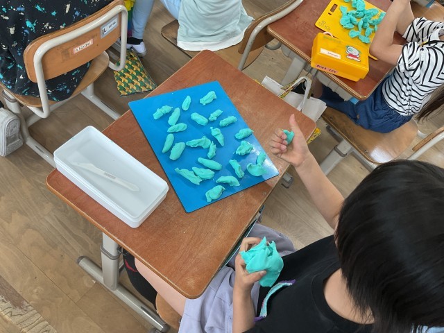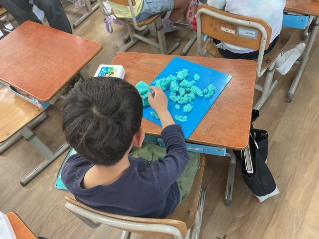 図画工作科「にぎにぎねんど」では、粘土を触る感触を感じながら丸めたり、ちぎったり、伸ばしたりと様々な形に変えることを楽しみました。